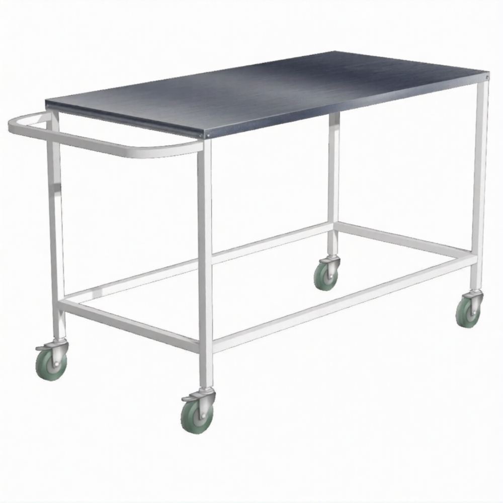 Стол инструментальный большой СИБ (каркас белый) — это большой мобильный стол, применяемый для размещения инструмента, материалов и медикаментов, в том числе в стоматологической практике, в кабинетах врачей, перевязочных, операционных, на постах медицинских сестер в отделениях больниц, клиниках, поликлиниках и других медицинских учреждениях. Модель имеет каркас из профильной трубы и столешницу из нержавеющей стали.