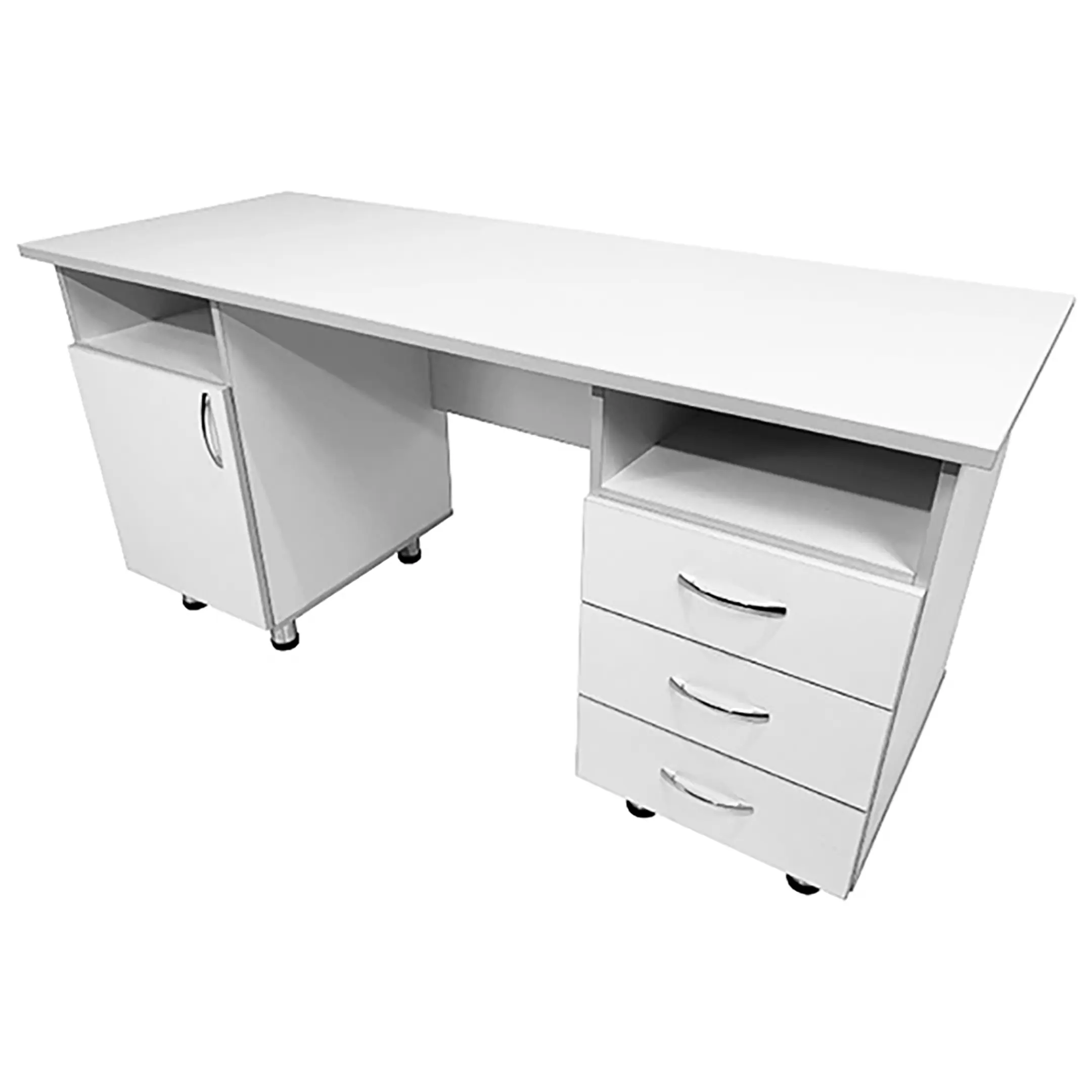 • Этот стол оснащен экраном и ручками-скобами хромированными размером 96 мм, добавляющими удобства в использовании. Разнообразные размеры ниши, ящиков и полок обеспечивают достаточно места для организации рабочего пространства.