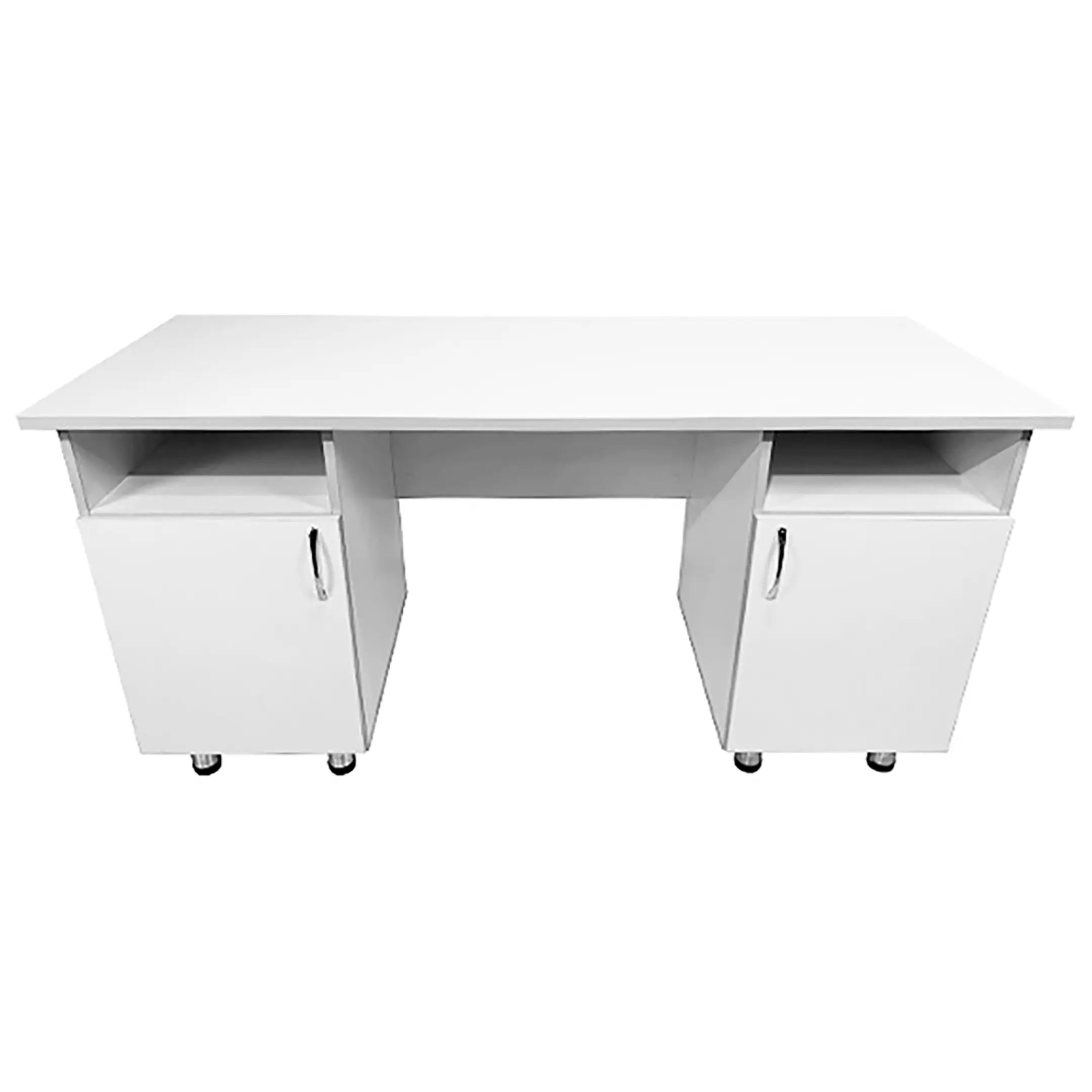 • Этот стол оборудован двумя боковыми тумбами, каждая из которых имеет нишу и отдел с дверкой и полкой внутри, обеспечивая удобное хранение необходимых материалов и инструментов. Дизайн выполнен в белом цвете ЛДСП с кромкой светло-серого оттенка, придавая изделию современный и профессиональный вид.