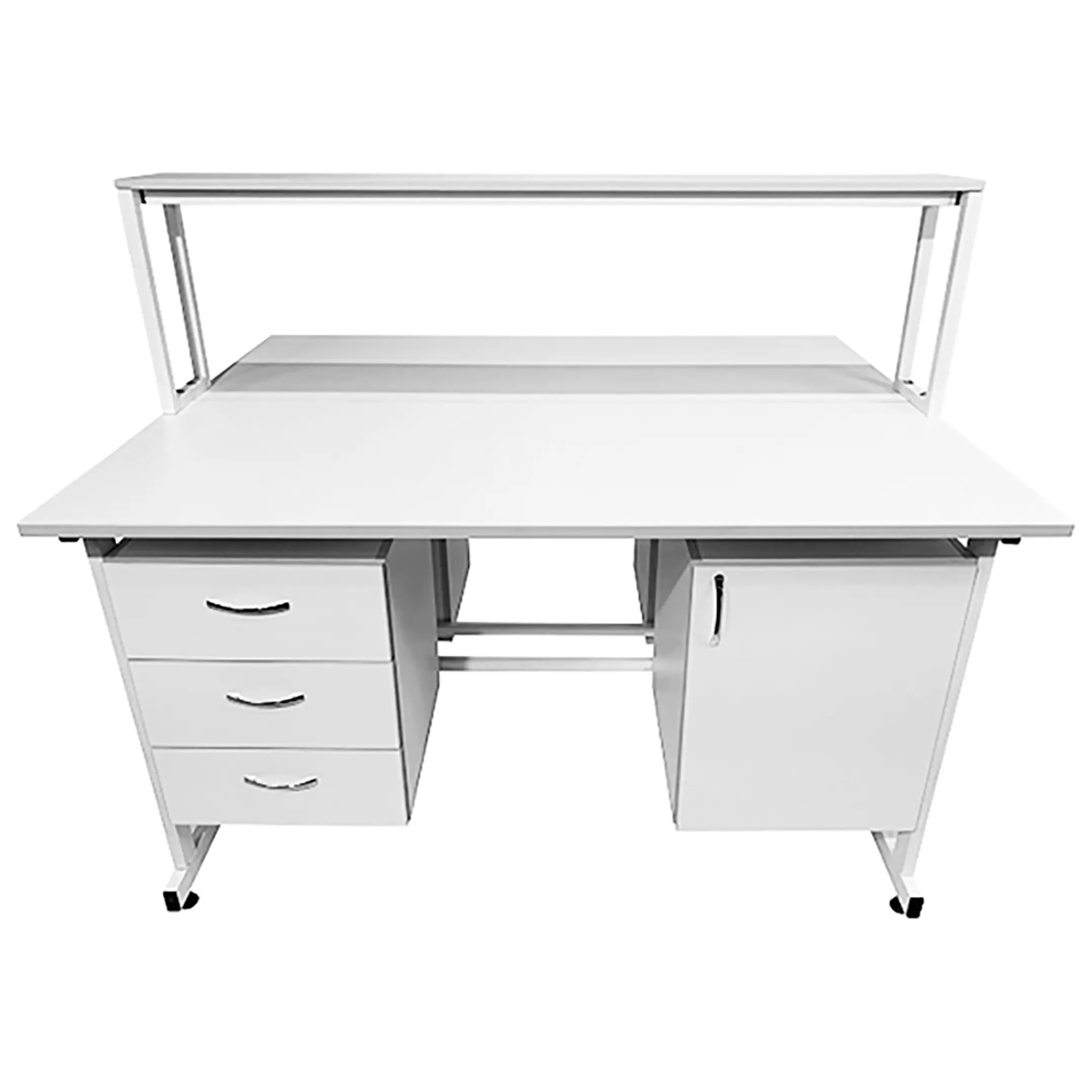 Стол лабораторный островной с надстройкой Сло 22.012 (белый) создан для удобной организации двух рабочих мест, идеально подходящих для лабораторий или медицинских учреждений. Благодаря его продуманным конструктивным особенностям, максимально рационально используются свободные пространства помещения. Модель оснащена двумя рабочими местами, каждое с двумя подвесными тумбами: слева с тремя выдвижными ящиками, справа с распашной дверкой и полкой, а также центральной надстройкой с одной полкой. Каркас выполнен из стального профиля, столешницы из ЛДСП толщиной 22 мм.