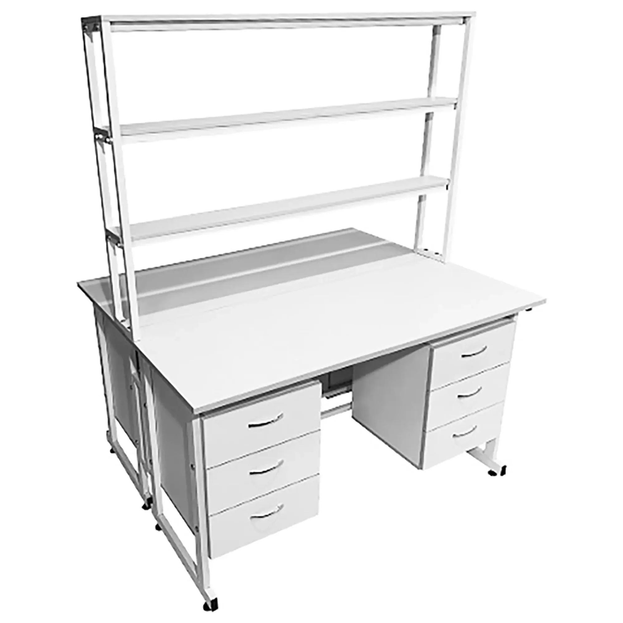 Стол лабораторный островной с надстройкой Сло 22.023 (белый) — это эффективное и удобное решение для организации двух рабочих мест в лабораториях или медицинских учреждениях. Модель оснащена двумя рабочими местами, каждое с двумя подвесными тумбами, имеющими три выдвижных ящика, и центральной надстройкой с тремя полками. Каркас выполнен из стального профиля, столешницы из ЛДСП толщиной 22 мм.
