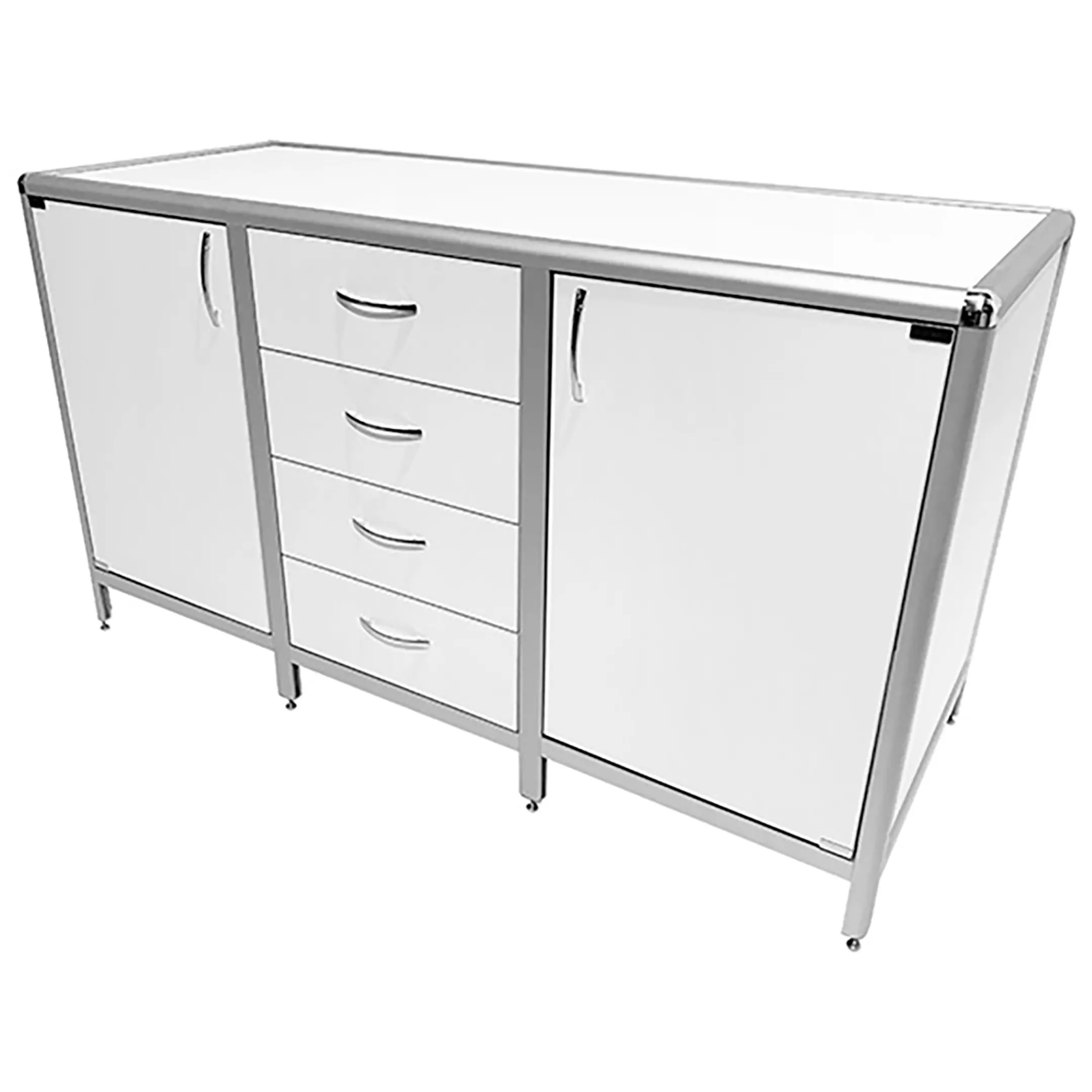 Стол-тумба лабораторная MED 12.021al (белый) — это функциональное решение для хранения лабораторного инвентаря, приборов и материалов в лабораториях и медицинских учреждениях. Модель разделена на три отдела: два боковых с дверкой и полкой, центральный с четырьмя выдвижными ящиками. Каркас выполнен из алюминиевого профиля, столешница из ЛДСП толщиной 16 мм.