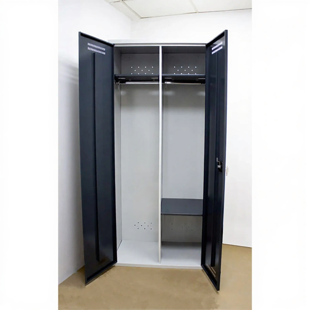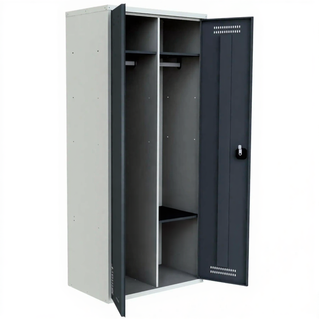 Шкаф SMART гардеробный — это универсальное решение для любых задач хранения и складирования вещей и инструментов. Модель имеет три типа комплектации с разным числом полок, перегородок и перекладин, а также возможность установки встроенной скамейки. Конструкция изготовлена из высококачественной листовой стали с надежным порошковым покрытием и оснащена вентиляционными отверстиями.