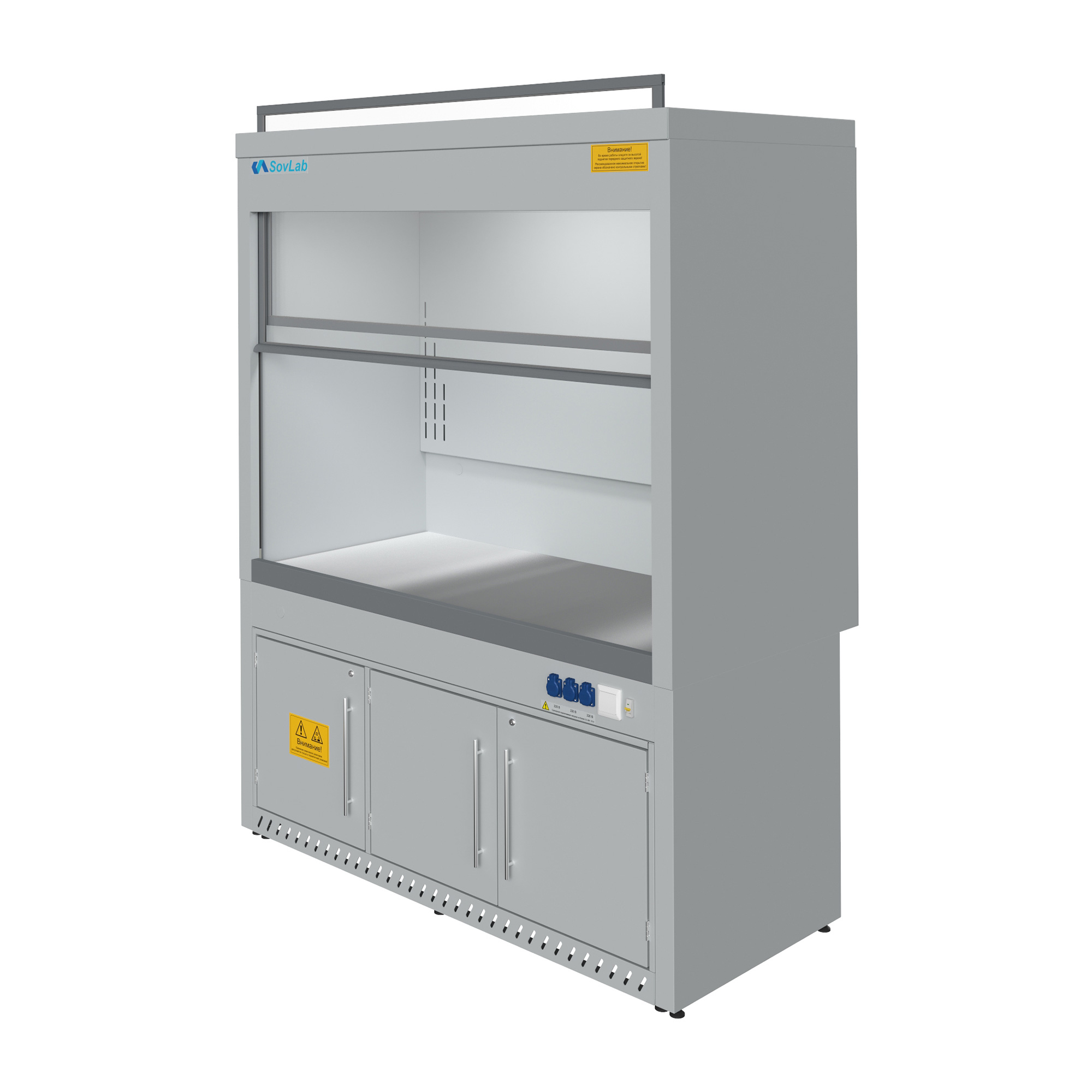 - Безопасная работа с летучими веществами — вертикально-подъемный защитный экран из ударопрочного стекла «Триплекс» фиксируется на любой высоте за счет системы противовесов.