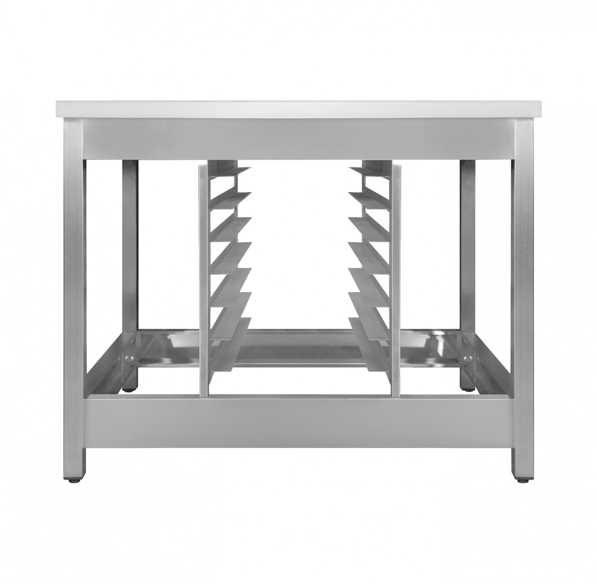В нижней части стола-подставки расположены полозья для размещения пекарских листов и противней. За счет регулируемых по высоте опор подставка максимально устойчива, что исключает раскачивание и опрокидывание техники.