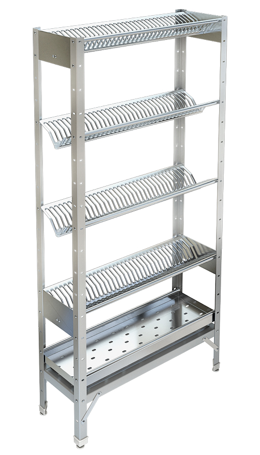 Стеллаж сушильный выполнен из нержавеющей стали, устойчив к образованию коррозии и деформации. Полки-кассеты рассчитаны на загрузку тарелок разной формы и диаметра, стаканы размещают на перфорированной полке. Вода с чистой посуды стекает в специальный поддон.