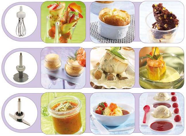 Модель поставляется в расширенной комплектации, в которую входят нож, съемные разборные насадки: насадка с системой герметичности с 3-мя уровнями, диск-взбиватель и насадка из нержавеющей стали, а.также венчик для создания таких продуктов, как супы, пюре, муссы, соусы, кремы. Скорость венчика регулируется в пределах от 350 до 1560 об/мин.