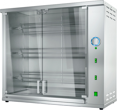 Гриль для кур Командор-2/3 Э — это профессиональное оборудование для предприятий общественного питания, предназначенное для обжаривания целых тушек кур на вертеле (шампуре). Приготовление тушек осуществляется благодаря инфракрасному излучению трех пар ТЭНов.