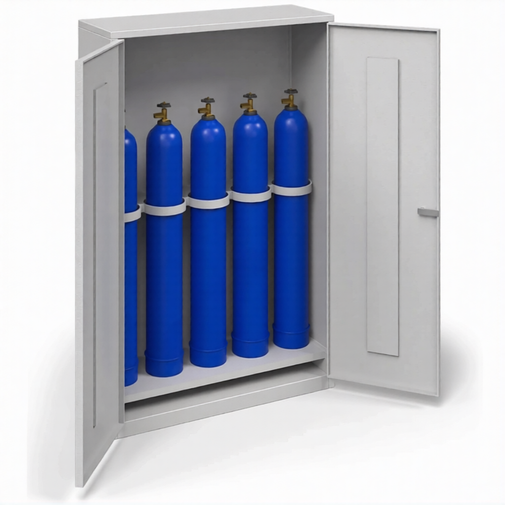 Шкаф для 5-ти кислородных баллонов на 10 л. ШГБК-014 усиленный — это специализированное и надежное решение для безопасного хранения и защиты кислородных баллонов малой емкости на производственных участках, в медицинских учреждениях, сварочных постах и учебных лабораториях. Модель представляет собой усиленный стальной защитный шкаф, где маркировка «ШГБК-014» указывает на его серию, а обозначение «для 5-ти кислородных баллонов на 10 л.» четко определяет его вместимость и назначение для работы именно с кислородом. Конструкция разработана с учетом повышенных требований пожарной безопасности при хранении окислителя, обеспечивая усиленную защиту баллонов от внешних воздействий, краж и несанкционированного доступа.