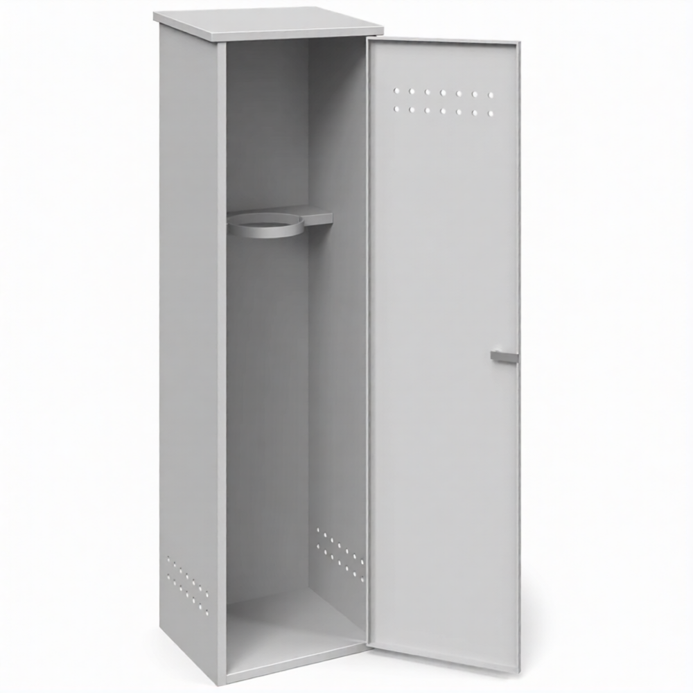 - Надежная антивандальная защита и сохранность имущества — усиленная сварная конструкция с массивными петлями, противосъемными штырями и возможностью установки врезных замков превращает шкаф в высокозащищенное хранилище. Это эффективно защищает дорогостоящий баллон и газ от краж, несанкционированного доступа и вандализма, особенно при уличной установке или размещении в проходных местах.