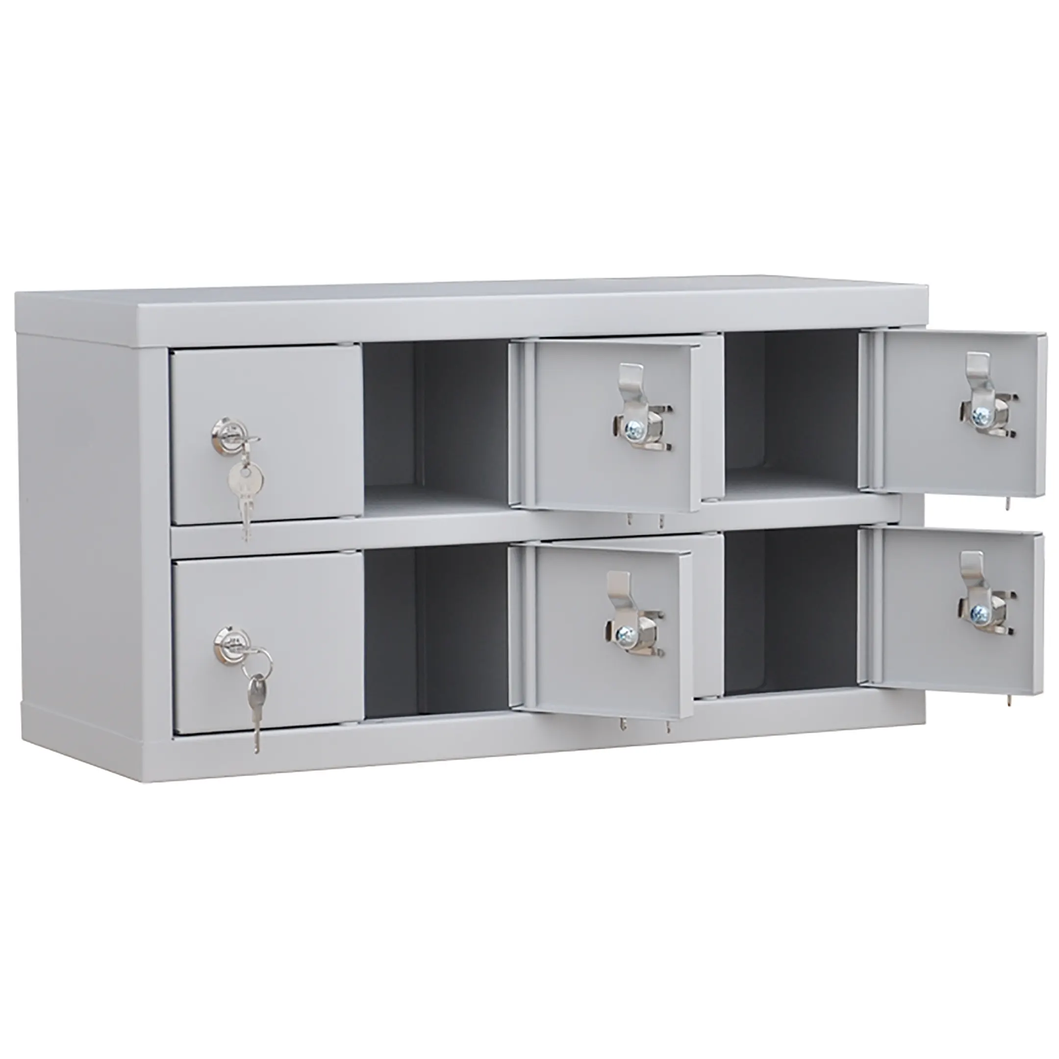 - Максимальная компактность и экономия пространства — шкаф предоставляет 8 индивидуальных запирающихся ячеек, занимая при этом минимальную площадь. Его можно легко разместить на краю рабочего стола, прилавке, полке или в нише, что делает его идеальным для мест, где каждый сантиметр на счету.