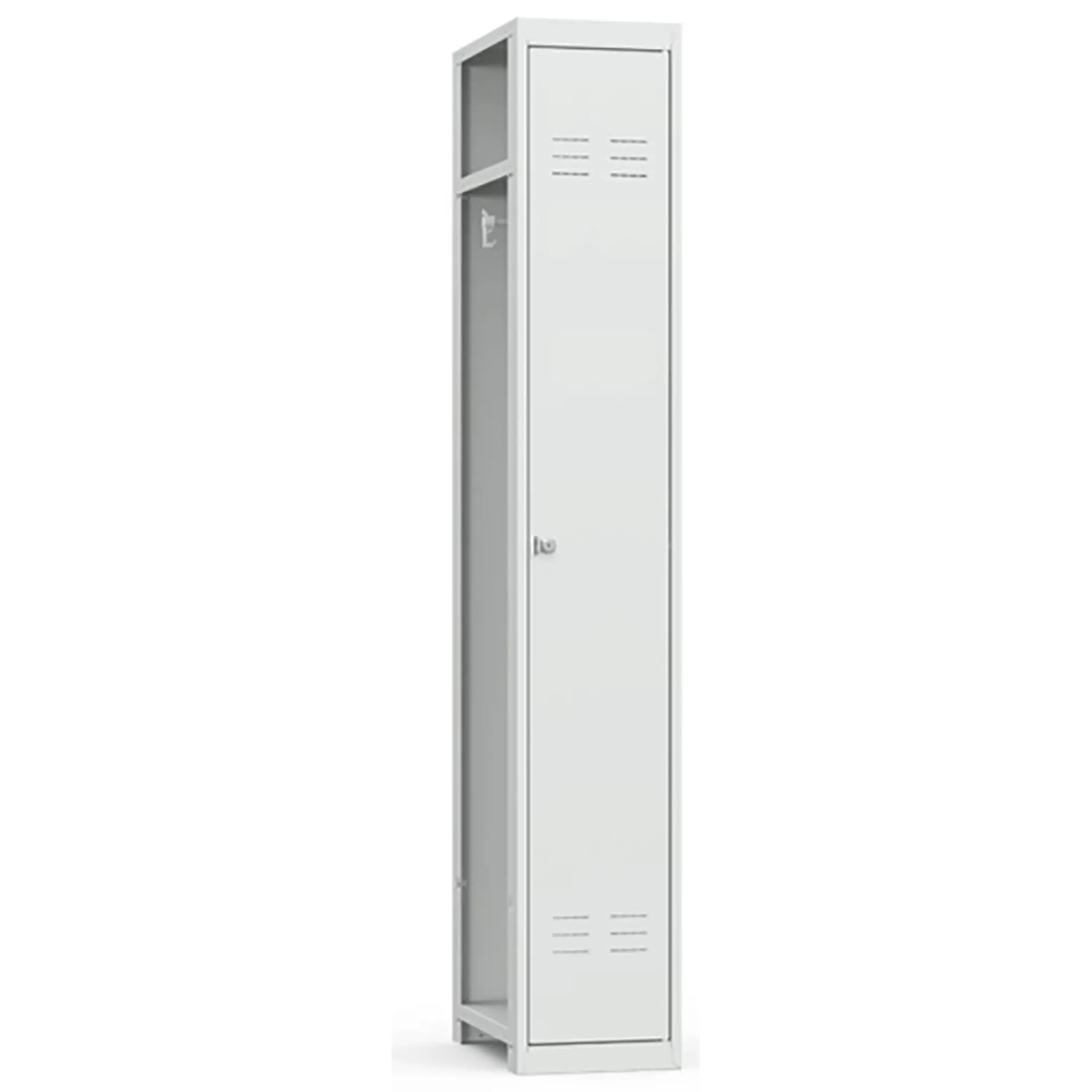 • Односекционный металлический шкаф для одежды имеет полную внутреннюю комплектацию: полку для головных уборов, пластиковые перекладины для вешалок и два крючка для одежды, проушина для навесных замков;