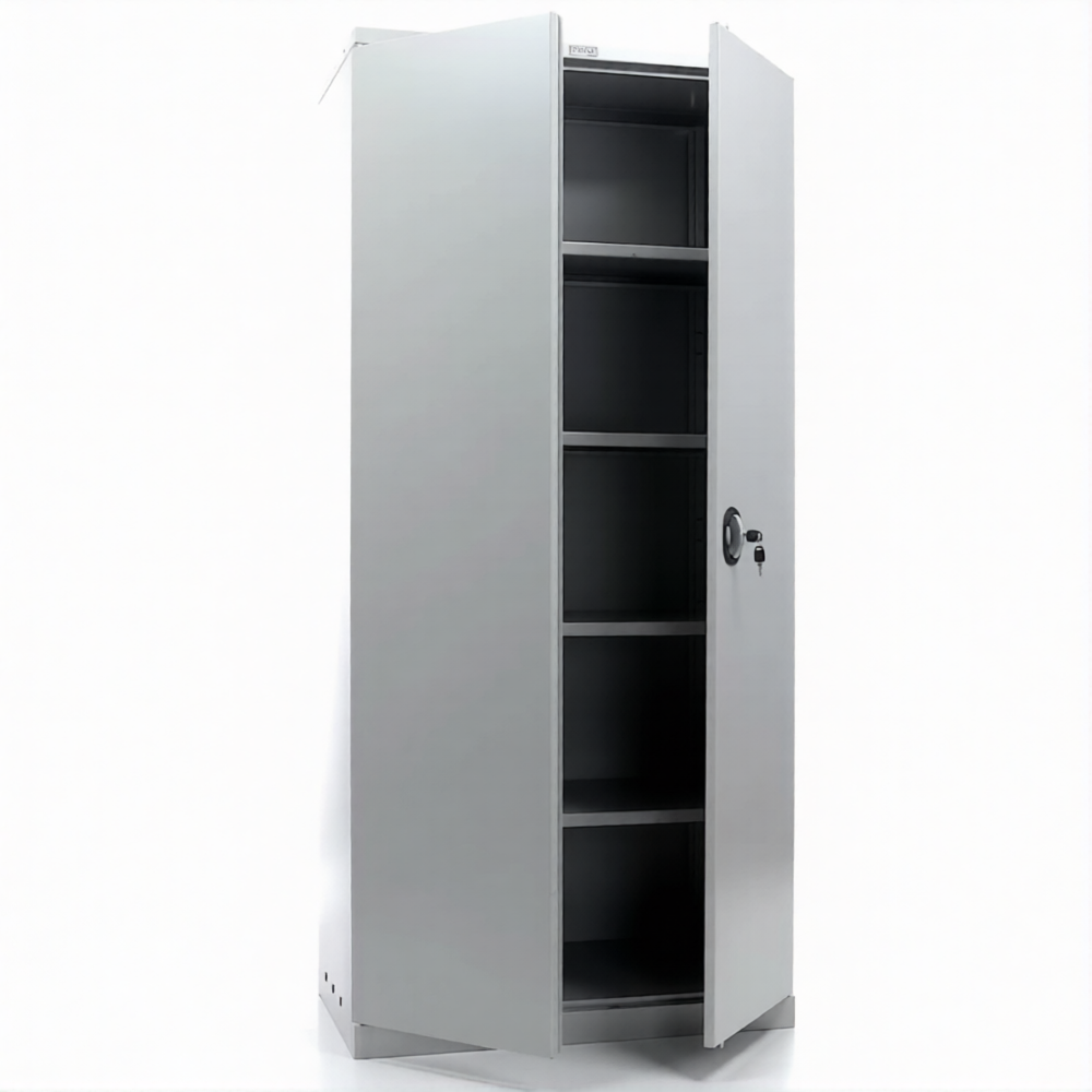 • имеет распашные двери, ключевой замок, регулируемые полки, фурнитуру;