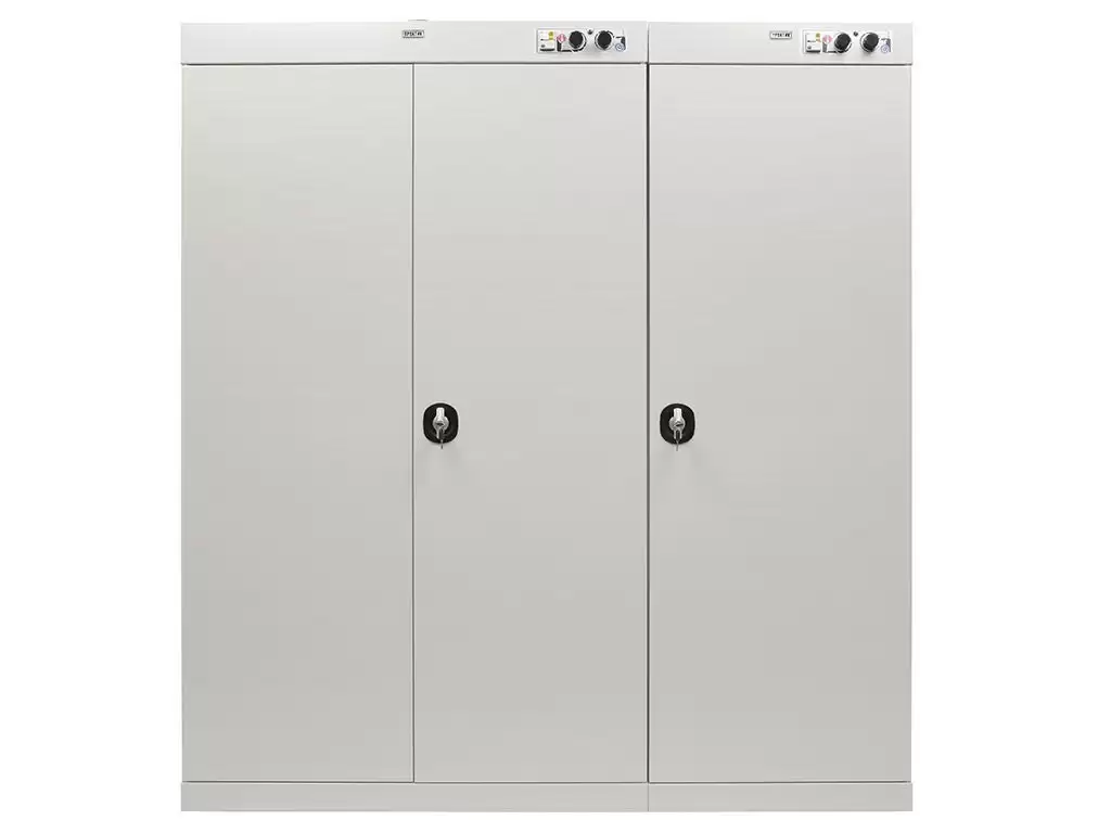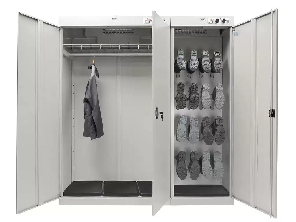 - Высокая производительность и вместимость — шкаф рассчитан на загрузку значительных объемов одежды и обуви за один цикл, что позволяет эффективно обслуживать большие коллективы на предприятиях, в спортивных комплексах или медицинских стационарах.